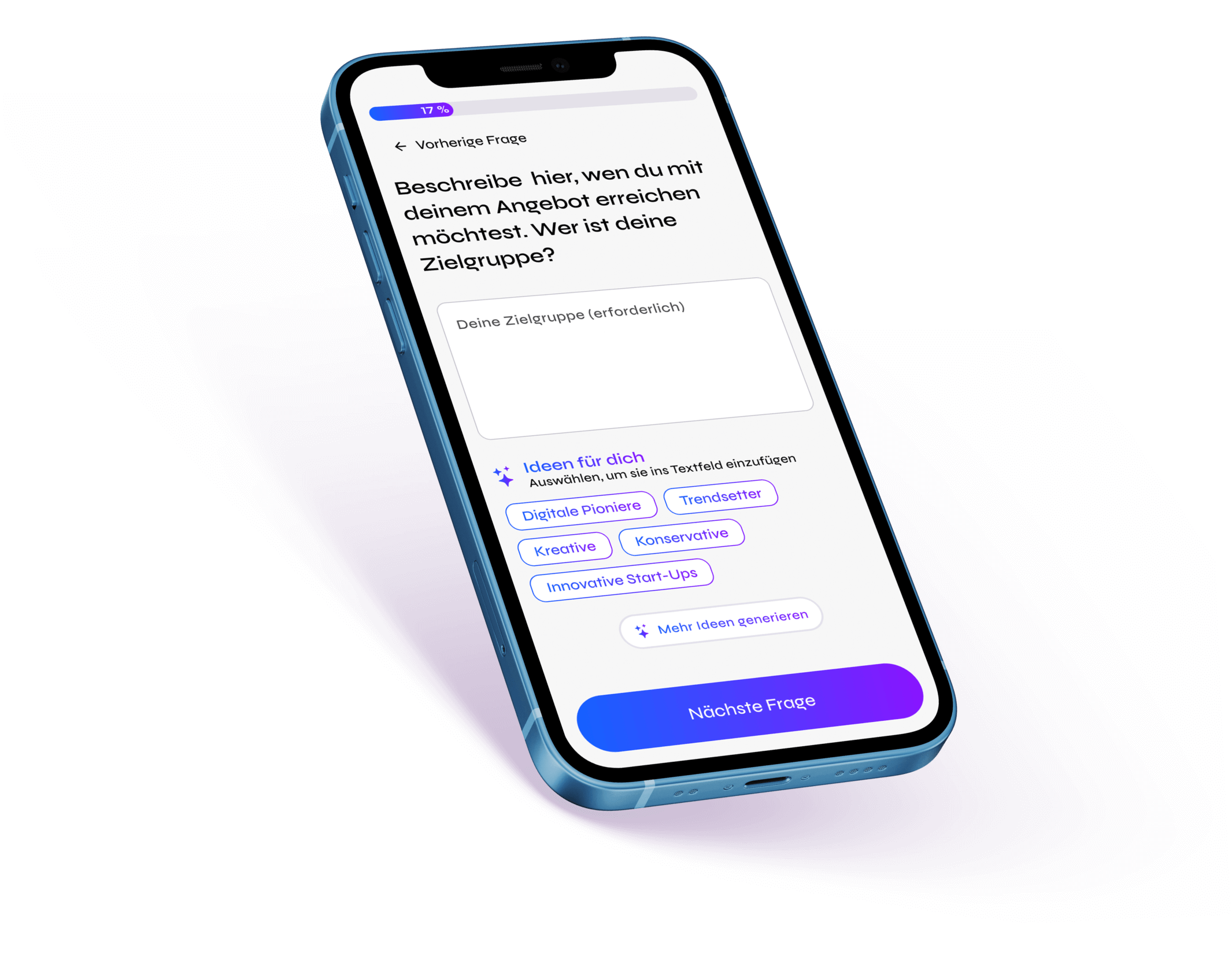 Verwandle deine Geschäftsidee in rund 30 Minuten in einen professionellen, bankfähigen Businessplan inklusive vollständigem Finanzplan. Unser KI-gestütztes Tool greift auf die jahrzehntelange Erfahrung unseres Teams zurück und macht den Prozess schnell, einfach und effizient. All das zu einem Bruchteil der herkömmlichen Kosten.